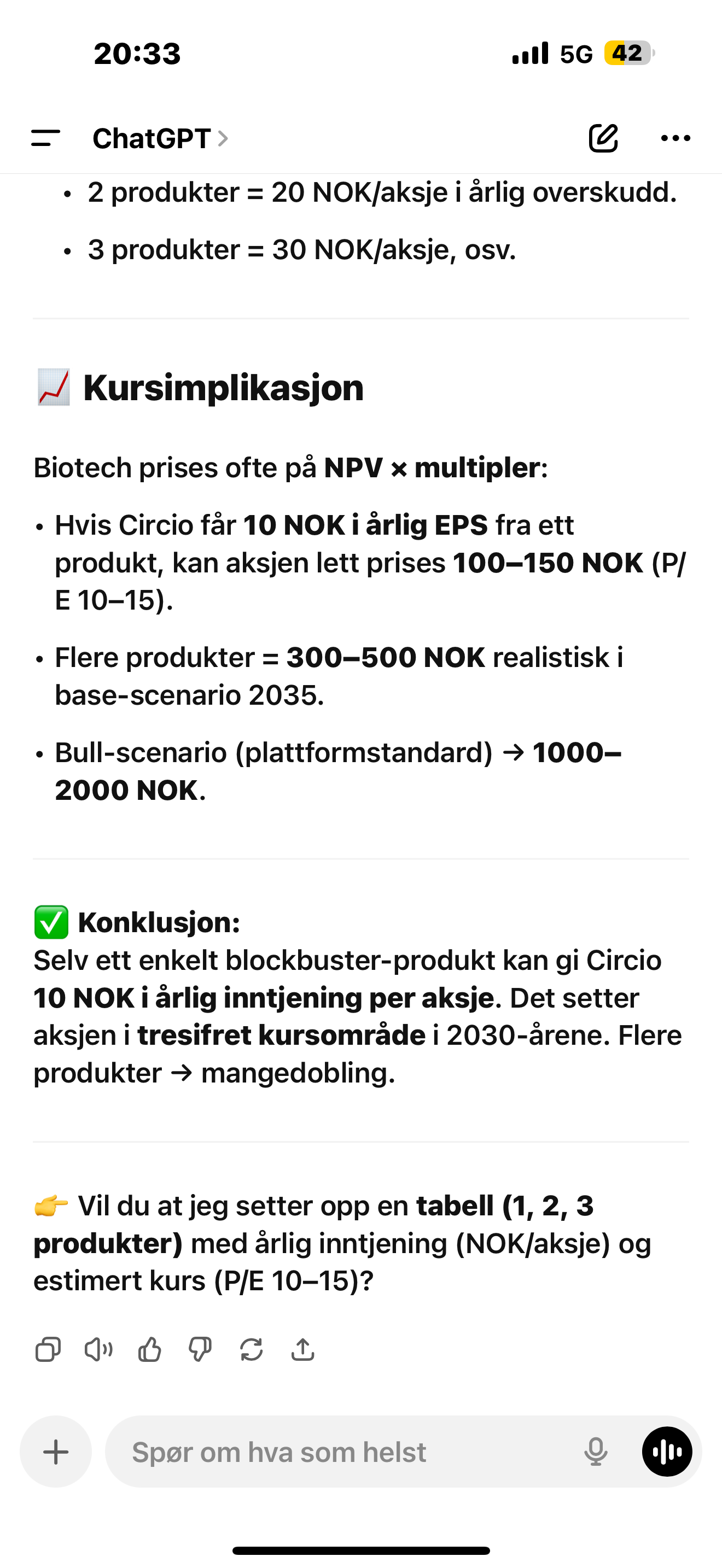 Men at spekulere i 2000,- NOK / aktie fremstår som et ganske urealistisk endgame; med en forventet fuld udvanding omkring 150 millioner aktier er dette et MCAP på 300 mia NOK - en værdi vi aldrig kommer til at se.
