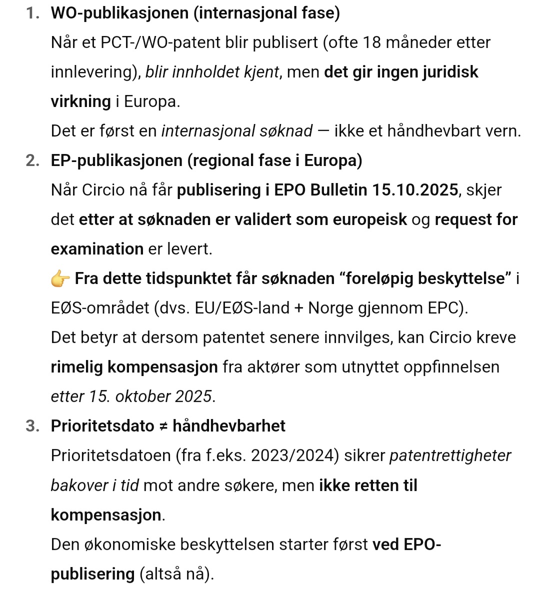 Patentet publiseres i dag i Regionalfase Euro - jeg kan dessverre ikke kommentere hvilke utvidelser av juridiske rettigheter og beskyttelse dette medfører - men aol sitt AI indikerer da at det skjer en utvidet økonomisk beskyttelse av patentet i regionen som det muligens kan være lettere å håndheve? At det er beskyttet fra tidligere mot “kopiering” er helt sikkert korrekt, beskyttelse inntrer vel allerede fra når søknaden er registrert og så er det ulike saksbehandlingsfaser for å avklare om noen har innsigelser mv. I dag blir det uansett hvordan en vurderer disse spørsmålene en Europeisk publisering uten innsigelser på patentet.
