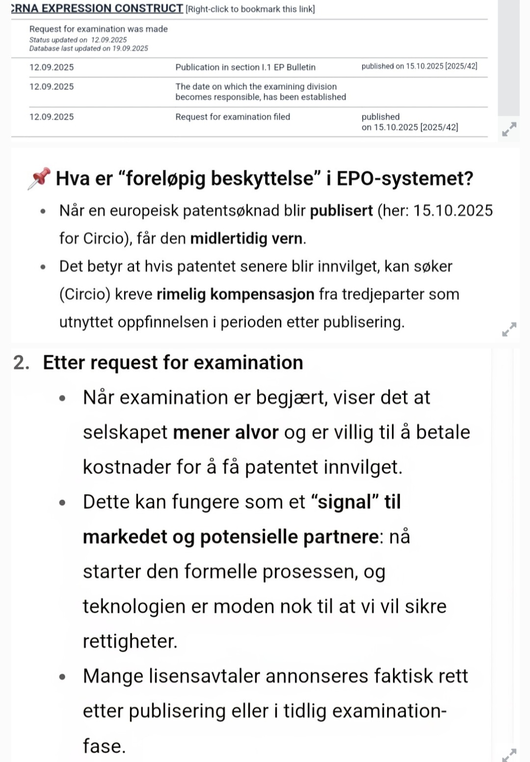 - oktober - i dag - er publiseringsdato for et av patentene til Circio. Videre så utløp 18 mnd varslingsfristen for AAV patentet i går 14. oktober.