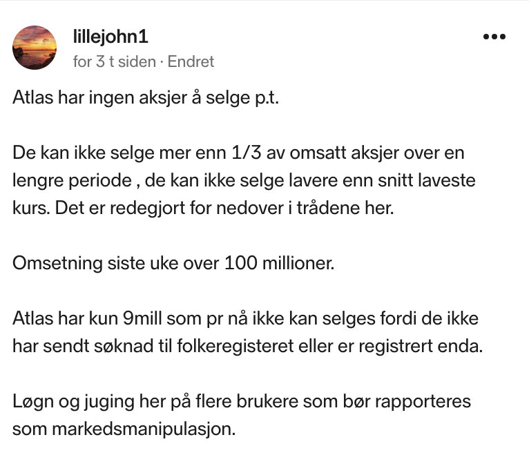 Har mer tro på at det er høy arbeidsbelastning på en liten organisasjon ( CRNA) som gjør dette. Og dersom Atlas kan selge short har det ingen hast for dem