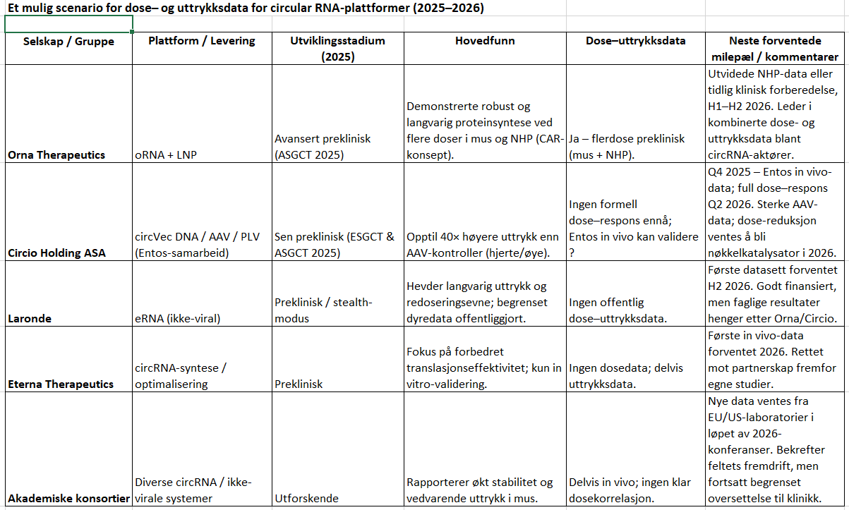 Pfizer, Roche, Novartis og AstraZeneca har alle IP og ansettelser innen circRNA, “stabilized RNA” eller forbedrede DNA-vektorer → De publiserer sjelden prekliniske data før partnering, så data kan komme brått.