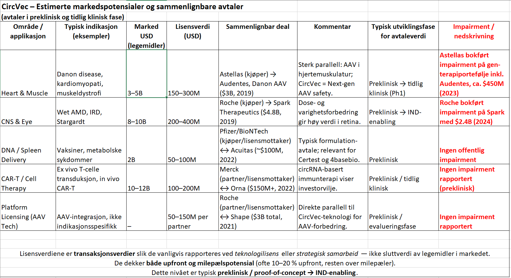 Konklusjon i den grad det er mulig; preklinisk avtale for Circio/circvec max MUSD 3-10 i upfront+milestones etter validering. Kanskje mer dersom avtalen er eksklusiv. Malurten i begeret, f.eks nedskrivningene som Roche og Astellas har gjort på sine transaksjoner fra 2019 og som beskriver risikoen som tas, samt at transaksjonsmarkedet har vært relativt dødt de siste årene.