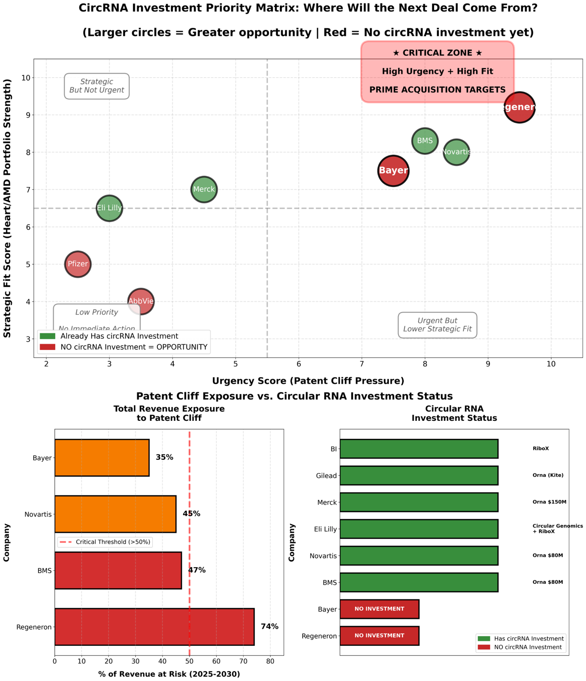 Bayer, Novartis, BMS og Regeneron synes å ha størst IP-utfordringer innen hjerte+øye, men verken Bayer eller Regeneron har gjort direkte investeringer i circular RNA som er kjent i markedet. Regeneron er antakelig den mest “desperate” av disse to.