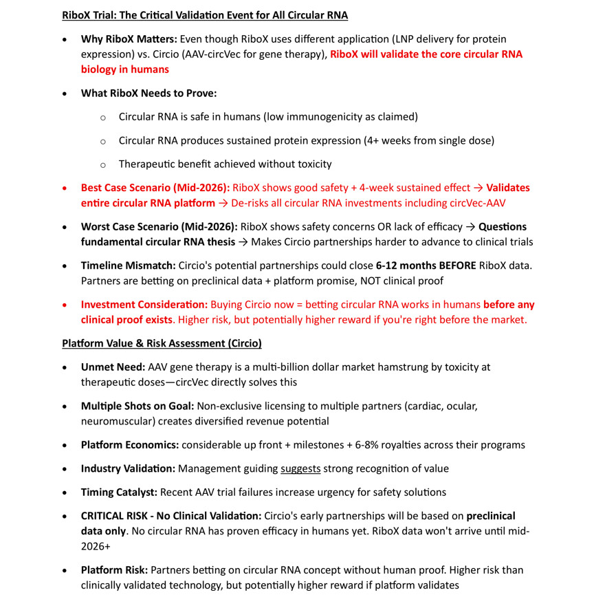 Så hva tenker mulige partnere om dette og evt lisensiering av circvec ? 1) ta et preklinisk bet på circvec, eller 2) vente på data fra RiboX. Eller sagt på annen måte - gå i front med relativt lav inngangsverdi og risiko, eller høy risiko om å bli fraløpt av andre aktører i markedet ?