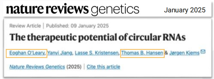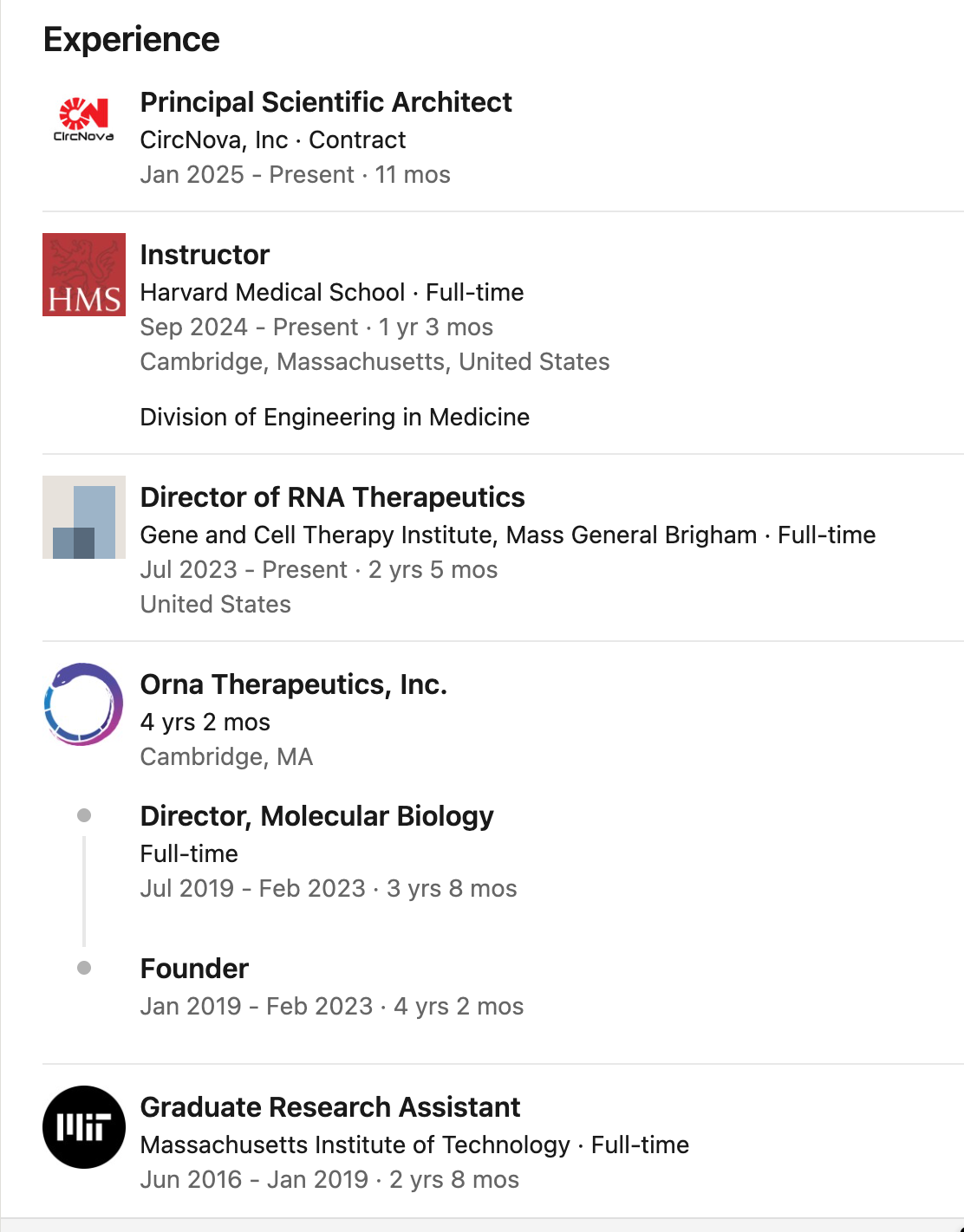 Han var en av grunnleggerne av Orna. Altså ett av topp 3 selskapene innen circular RNA som Circio plasserte seg sammen med allerede i 2023. Han har siden gått tilbake til akademia med tilknytning til Mass General Brigham