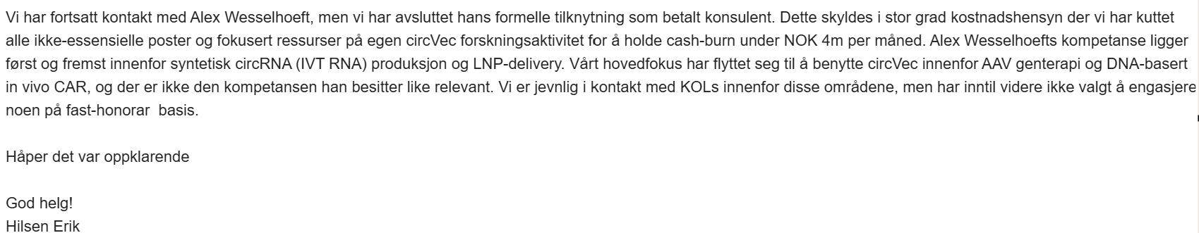 Gjeldfritt selskap, mcap ca 130 mill og circVec med glimrende resultater.