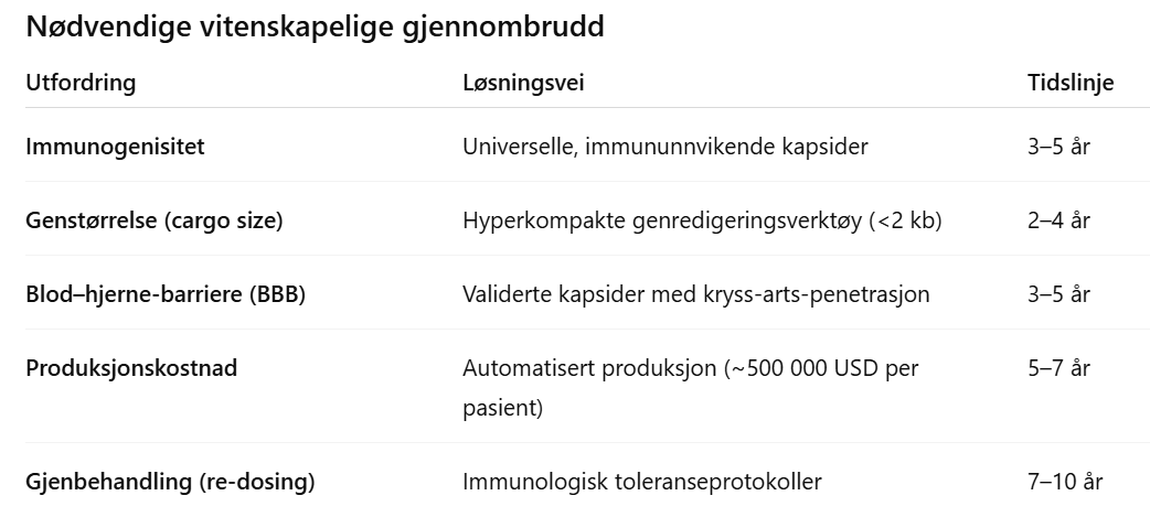 De største hindringene er doserelatert immunreaktivitet, eksisterende antistoffer (hos opptil 70 % av befolkningen), begrenset genstørrelse (4,7 kb) og svært høye kostnader (ofte over 2 millioner USD per pasient). Varierende effekt (1–75 %), og trygg gjenbehandling begrenses av immunrespons. Videre finnes utfordringer med skalerbarhet, vektorkvalitet og levering over blod–hjerne-barrieren (BBB). Disse tekniske og biologiske barrierene forventes å ta 3–7 år å løse.