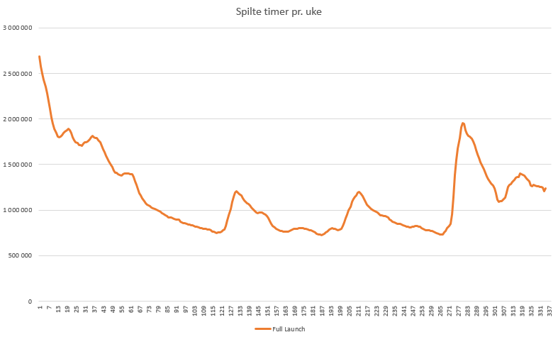 Utviklingen i spilte timer nå frem til free weekend. Litt spennende å se hvor stor effekten blir denne gang. Siste topp er da forrige free weekend.
