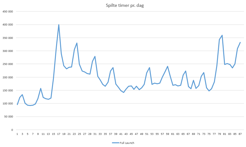Her er spilte timer pr. uke siden litt før første free weekend (fra siste bunnen før f2p) og frem til i går.