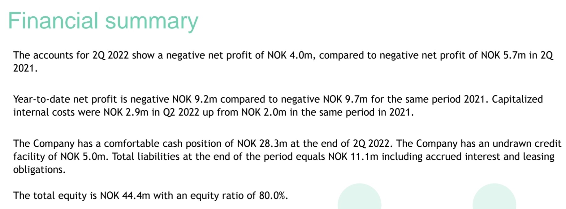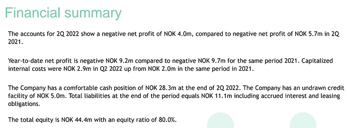 28 mill på bok. Uvisst hva burn er, men ser balansen har økt litt. Antar burn rundt 5-6 mill pr q. Inkl kreditt virker de å ha grei runway.