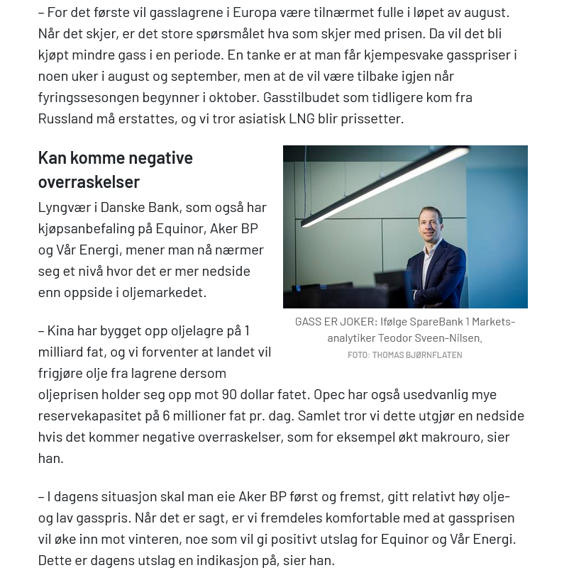 I tillegg kommer eventuelle fÞlgeeffekter i verdensÞkonomien gjennom inflasjon og renter. Siden i fjor har lagernivÄene Þkt en del som fÞlge av Þkt produksjon og tilfÞrsel fra strategiske lagre, sÄ det er noen stÞtteputer.