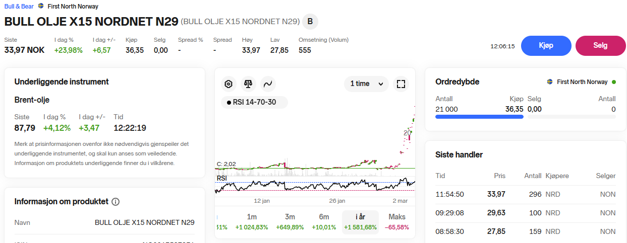 Bull olje x15 opp hittil over 4000% siden Trump sendte flåten mot Iran, og 900% bare siden fredag 27. feb.