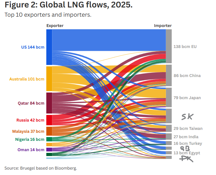 Tenker man kjøpekraft og politikk, vil jeg ut fra figuren når det mangler LNG fra Qatar, tenke at Kina og til dels India? tar mer fra Russland og Europa tar laster fra USA som skulle gått til Tyrkia og Egypt. Pakistan får bare klare seg med mindre.