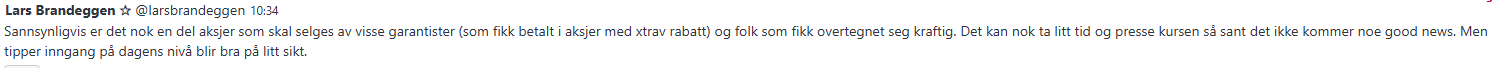 På nyeste lister har han allerede solgt alt igjen. Samtidig legger jeg merke til at Lars Tore Brandeggen fra Aksjesladder på nyeste lister har kjøpt fler aksjer via sitt firma U-TURN VENTURES AS. Er det et vakuum case han gambler på skal oppstå?