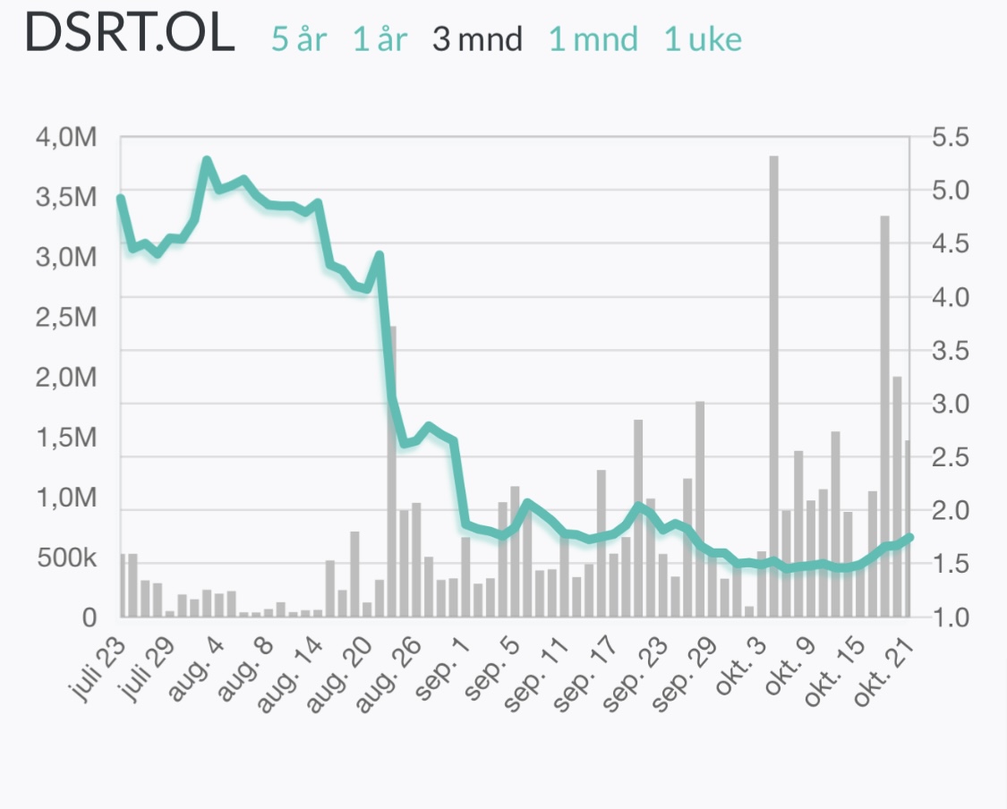 Etter flere måneder med fallende trend ser DSRT ut til å ha funnet støtte i området 1,45–1,55 . De siste dagene har kursen stabilisert seg og etablert seg over 1,70 , med økende volum og et RSI som har brutt opp fra oversolgt nivå. Dette tyder på at momentet begynner å skifte fra kapitulasjon til oppbygging .