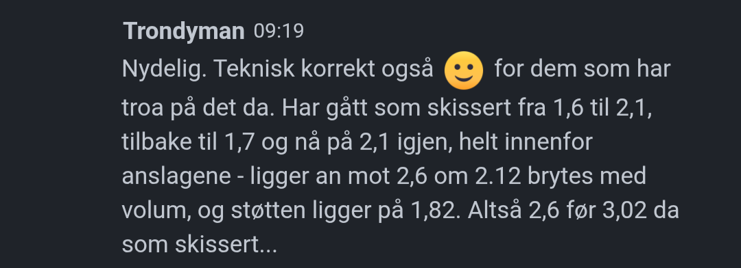 Er ganske spent på dagene fremover nå. Vi kom over 2,10 igår og i morgen er det rapport.