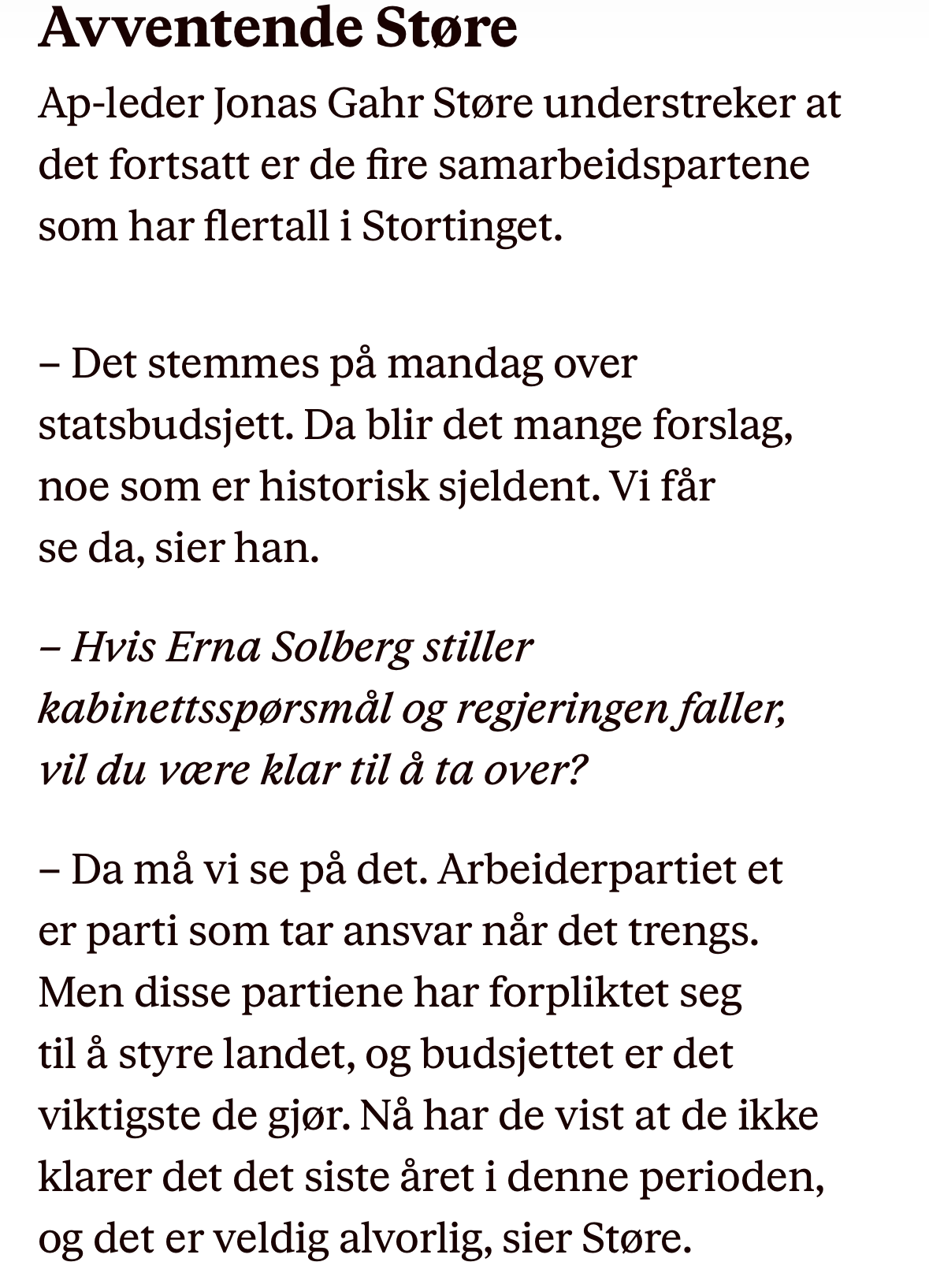 Ap har ikke noen hast med noe som helst. De sitter i praksis i regering till det kommer en ny, og Aps politikk gjeller tilsvidere.