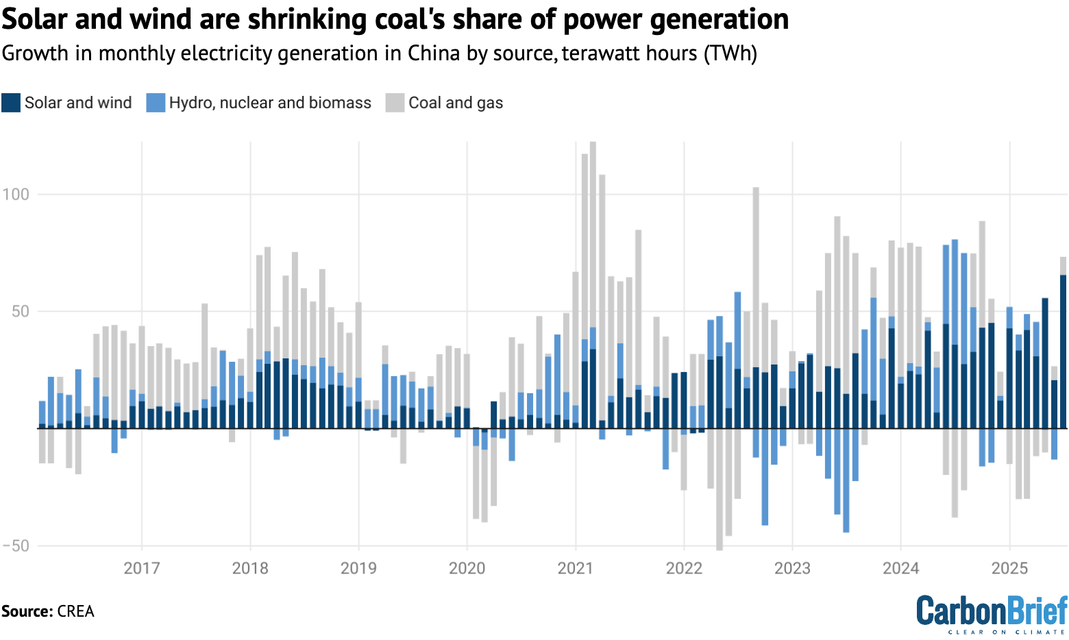 En graf som vel er litt vanskelig å lese, den går altså m-o-m. Hvis man ser på 2024, så er det større totalt grått område over nullen enn under, mao, de økte kullbruken sin. Samtidig, så er det jo også sånn at hittil i 2025, så har de redusert kullbruken sin.