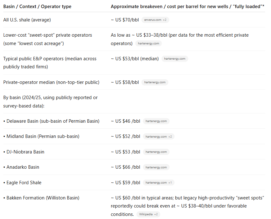 Kilden er denne artikkelen fra 2023, så break-even er nok høyere nå. US Shale Basins Boast $54/bbl Average Breakeven Price - Hart Energy