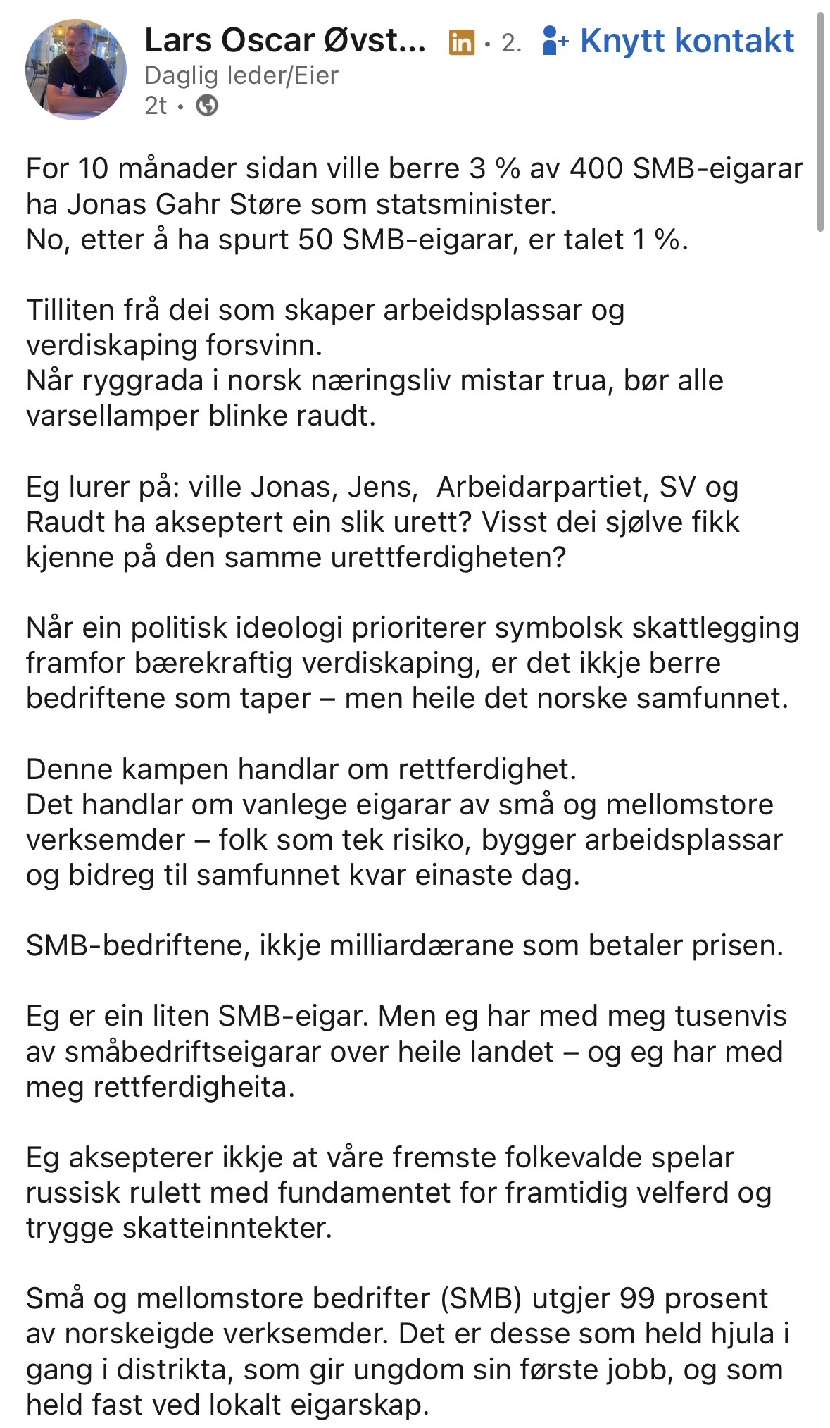 Man kan jo også se an konkurransesituasjonen i visse sektorer hvis man gidder det. Hvor lett er det egentlig å lykkes i et lite marked som i Norge? Og hvis man i tillegg ser hvordan regjeringen legger til rette for grundervirksomhet?