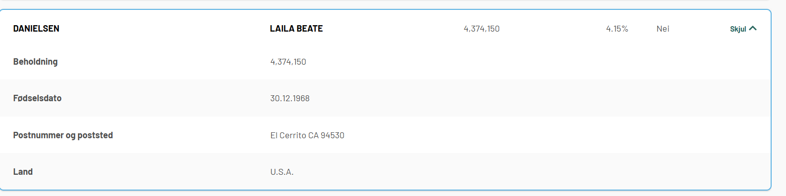 Enig i dette, men hun risiker jo også å “miste” mange aksjer i transaksjonen om hun si skulle ha de over i et holding selskap. Da uten viten om GAV og selvsagt pris på tilbakekjøp. Det virker ihvertfall ikke som dette er hensikten i om med at hennes eget selskap er slettet. Kan som noen sier være at hun ønsker å flagge ut. Hvil anta at hun er skattetilhørende Norge selv om hun bor i USA?