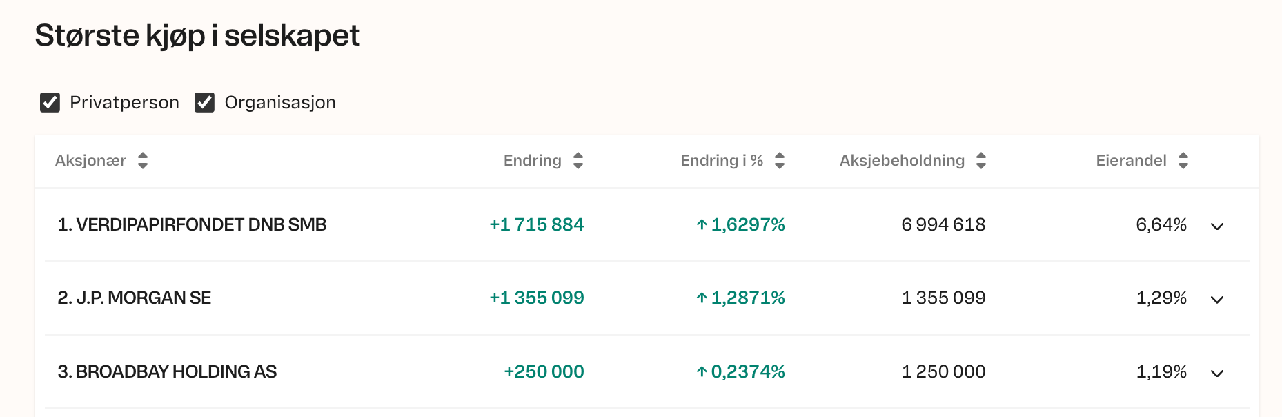 Legger også merke til at Vintersua (som hadde en stor post tidligere) har kjøpt seg inn igjen, dog med «bare» 40.000 aksjer.