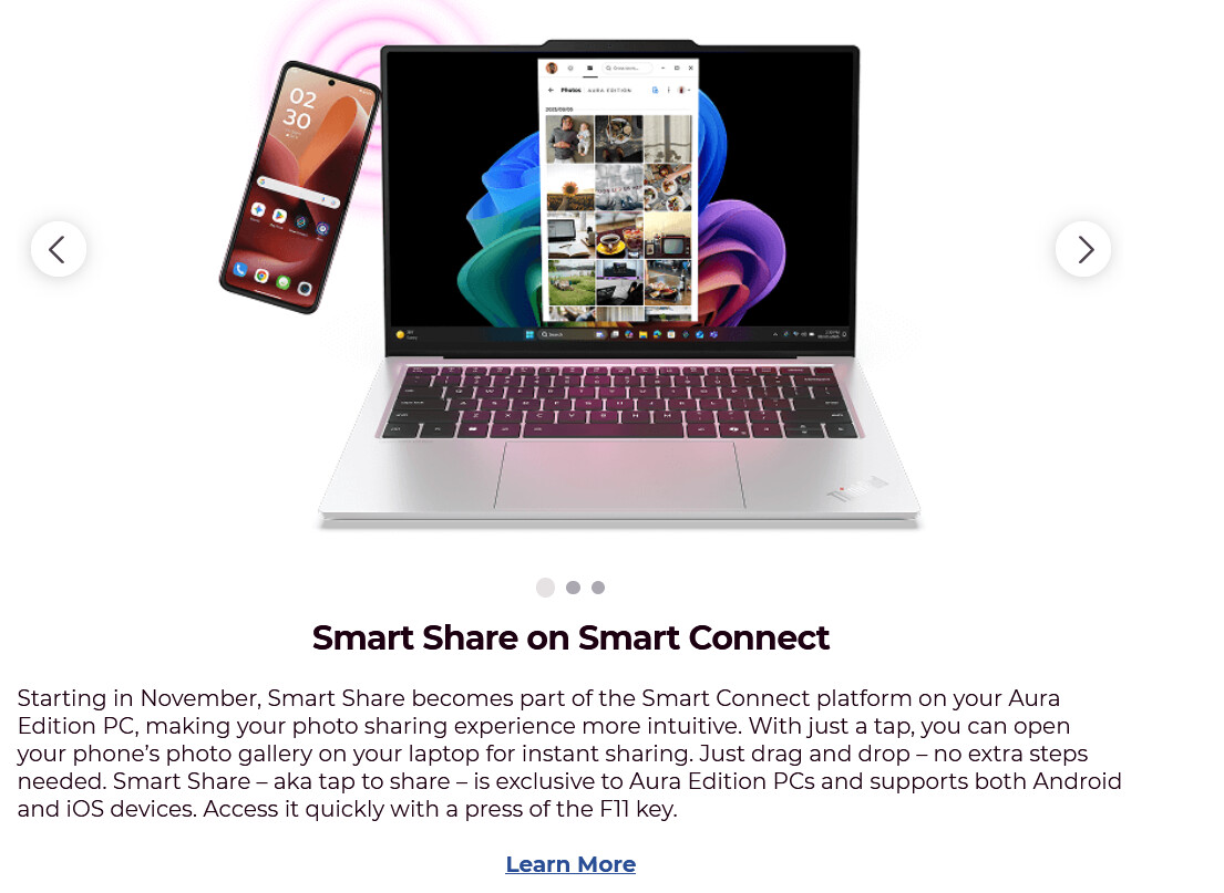 “tap to share is exclusive to Aura”…foreløpig ingen tegn til at denne appen skal bli tilgjengelig bredere i Lenovo-verdenen.