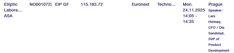 Oppriktig glad for at du liker mine oppdateringer. Og grunnen til at jeg var “tett på” denne gangen, var at Pareto var tett på og sendte en reminder: “Reminder: Agenda & Invitation to Pareto Securities’ 6th Annual Nordic TechSaaS Conference, 13 November 2025”. Jeg blir jo ikke oppriktig glad når jeg ser hvor lite tett på Laila er på dette. Og enda mindre oppriktig glad hvis Elabs virkelig sender en som er i oppsigelse til å presentere selskapet. Men det er mulig du tweedR blir oppriktig glad for at de sender Lars på dette. Med kurser nær ATL er det vel ikke så farlig. Laissez-faire.