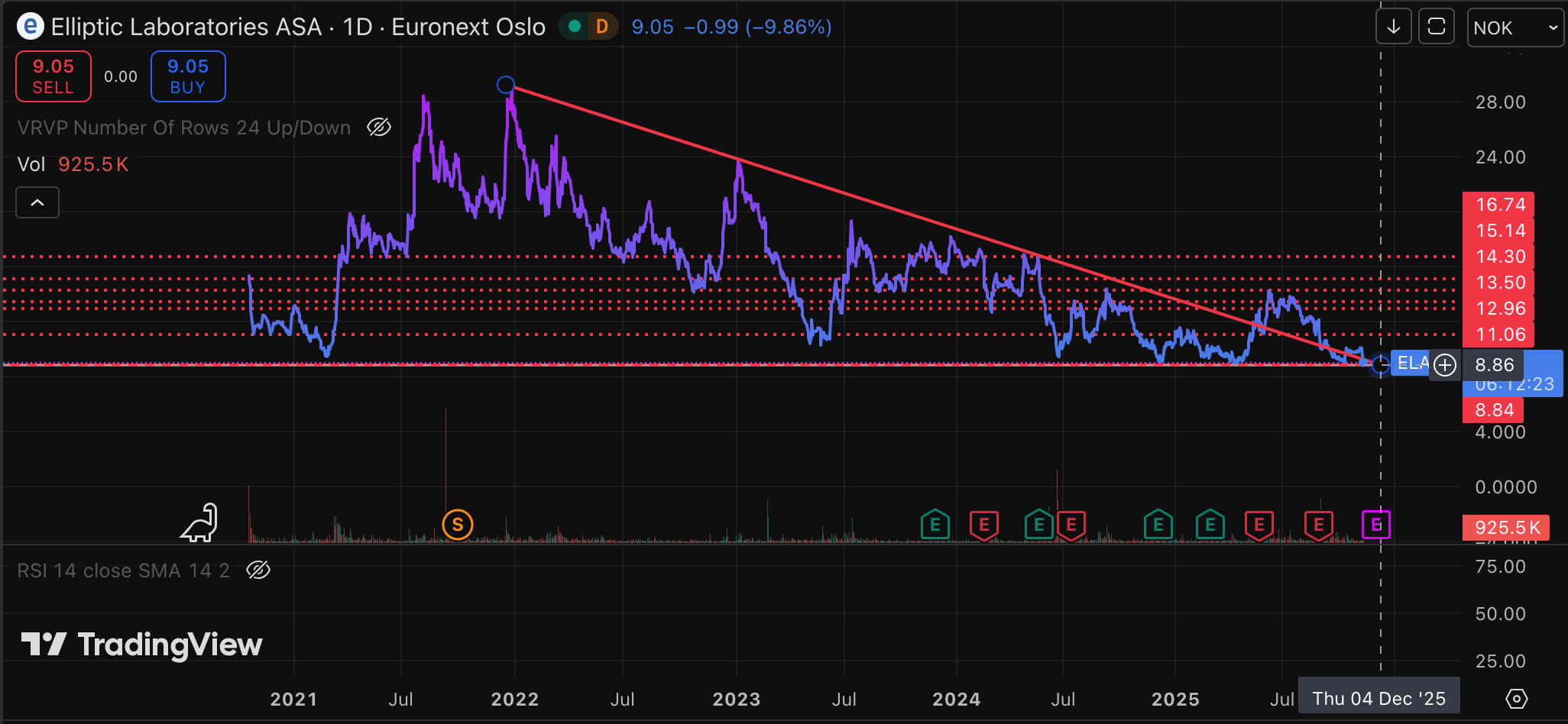 Dagens store humor er naturligvis følgende skjermbilde. Det viser den nedadgående trenden fra ATH til ATL-linjen. Den trendlinjen treffer bunnlinjen 4. desember 2025. Can’t make this shit up. Nå skal jeg begynne å lese horoskop-sidene i Allers og Hjemmet med det største alvor!