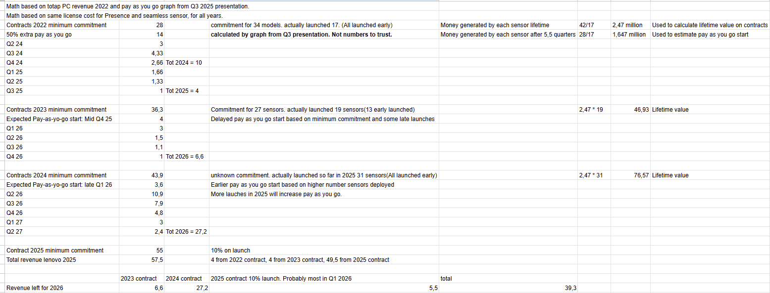 Selv om talla mine er veldig feil, skal pay-as-you-go vere en del høgere i 2026 basert på kraftig økning i lanseringer. Det som kan ødelegge reknestykket er om Seamless license fee er lavere enn Presence.