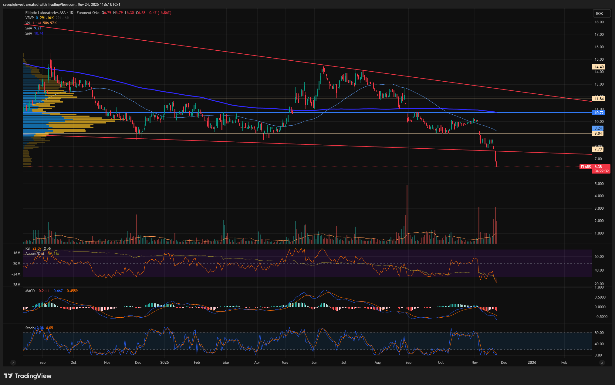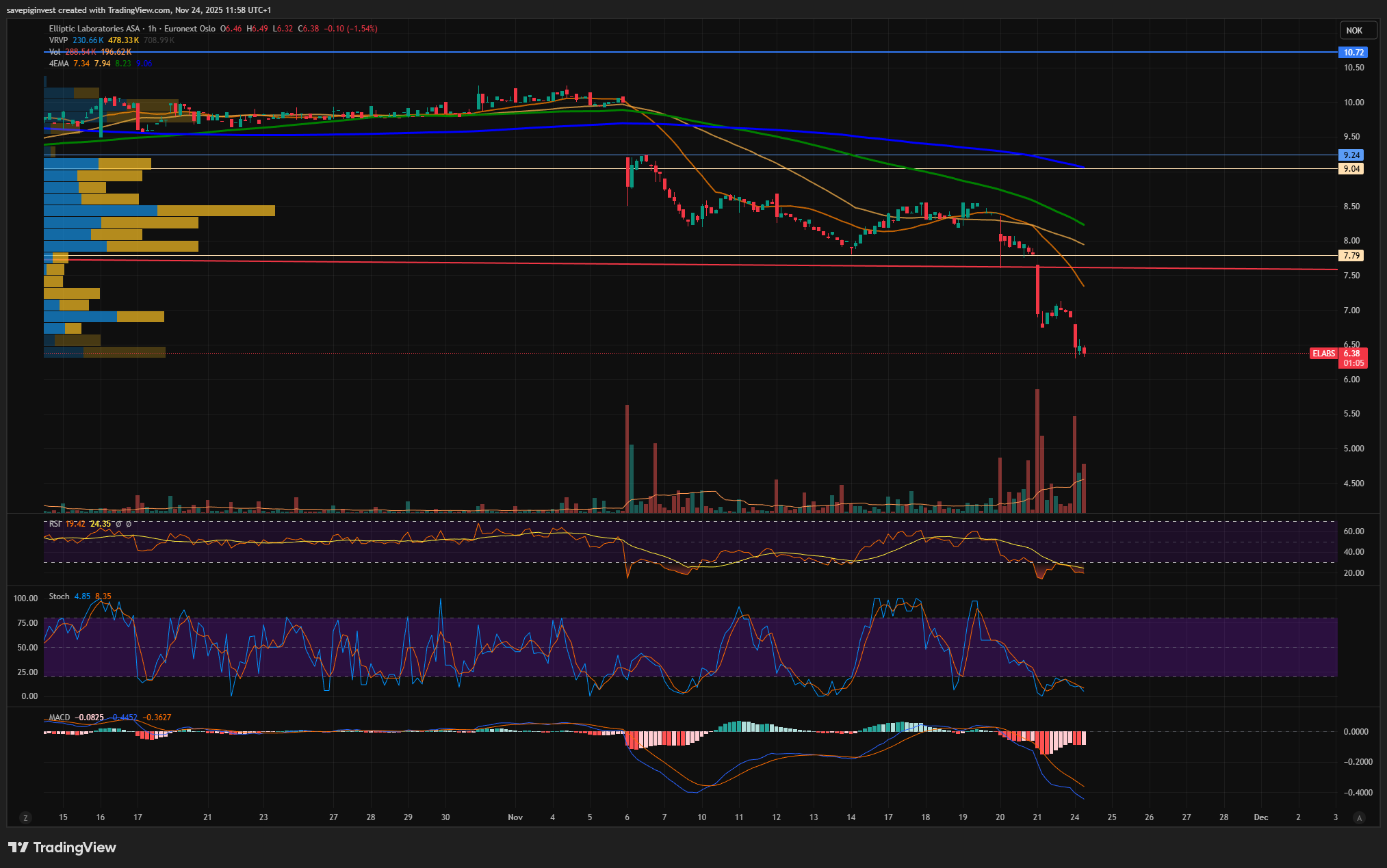 Elliptic Laboratories har brutt ned gjennom gulvet i den fallende trendkanalen på mellomlang sikt. Dette signaliserer enda sterkere falltakt. Det er ingen støtte i kursdiagrammet og en videre nedgang indikeres. Ved reaksjoner opp har aksjen motstand ved cirka 9.00 kroner. Negativ volumbalanse viser at volumet er høyere på nedgangsdager enn på oppgangsdager. Det indikerer at optimismen er avtagende hos investorene. Det kortsiktige momentumet i aksjen er sterkt negativt, med RSI under 30. Det indikerer økende pessimisme hos investorene og videre kursnedgang for Elliptic Laboratories. Aksjen anses samlet sett teknisk negativ på mellomlang sikt.