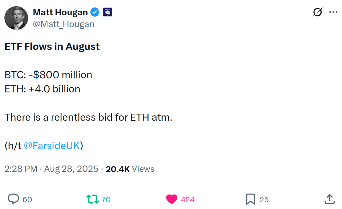 ETH ser etterspørsel som en råvare, for eksempel fra registrering av .eth-brukernavn på ENS (Ethereum Name System). ETH ser også etterspørsel som penger når folk ønsker å handle brukernavnene. Summen av markedsdeltakernes subjektive mening om ETHs verdi er det som setter prisen. Ethereum prøver ikke å “skalere med bankvirksomhet”, siden det ville undergrave etterspørselen som råvare og penger.