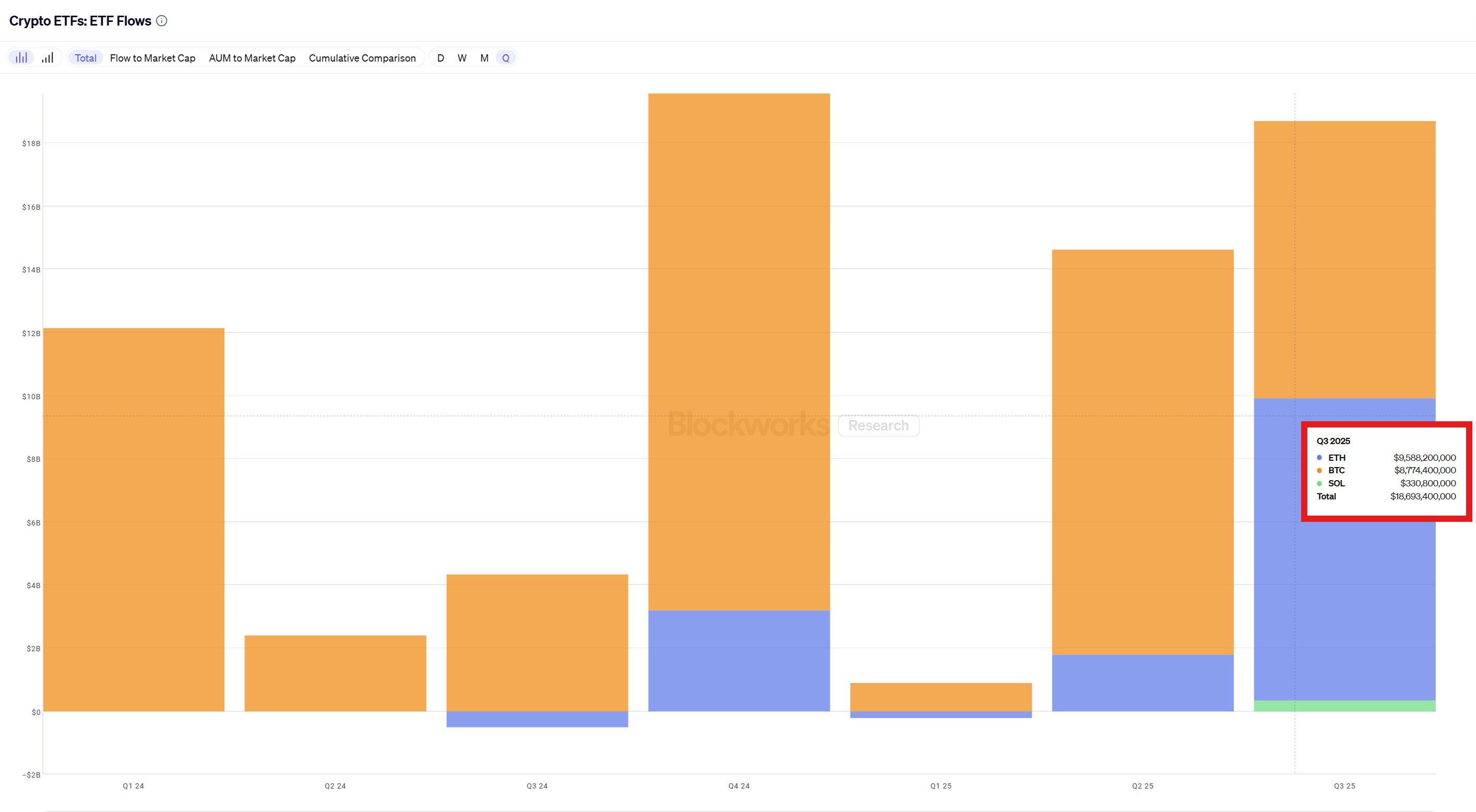 Ethereum hadde nettopp sitt sterkeste ETF-innstrømningskvartal noensinne, med en innstrømning på 9,58 milliarder dollar i 3. kvartal 2025 og overgikk Bitcoin for første gang.