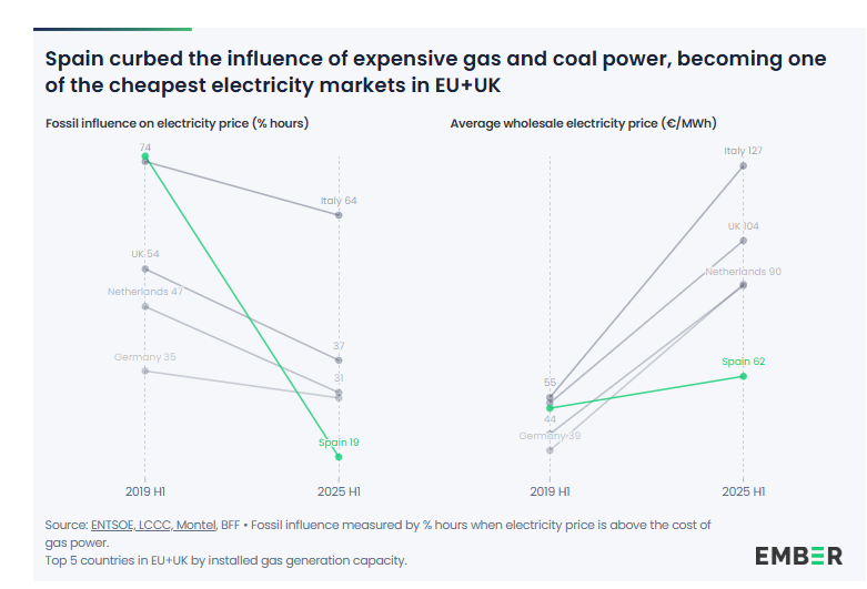 " In the first half of 2019, Spain’s power prices reflected the cost of fossil generation in 75% of hours – this dropped to just 19% in the same period in 2025. As a result, Spain’s average hourly electricity price in the first half of 2025 (62 €/MWh) was below the cost of generating electricity with gas, which averaged 111 €/MWh during the same period, ranging between 87 and 148 €/MWh."