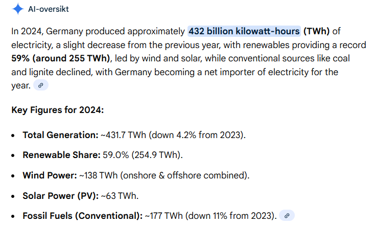 Tyskland er for øvrig ikke “verdens beste fornybarland”. Det er bare tull. Det er ikke en gang på beste halvdelen i EU. (57 % i Tyskland vs 61 % snitt i EU).