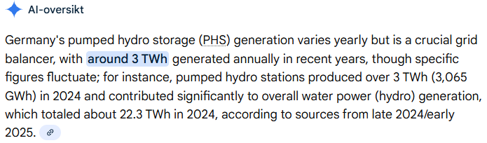 Sammenligner man Tyskland sien årlige 3 TWh med pumpekraft med hva Norge produserer eksporterer av vannkraft så er den mindre enn 10%.