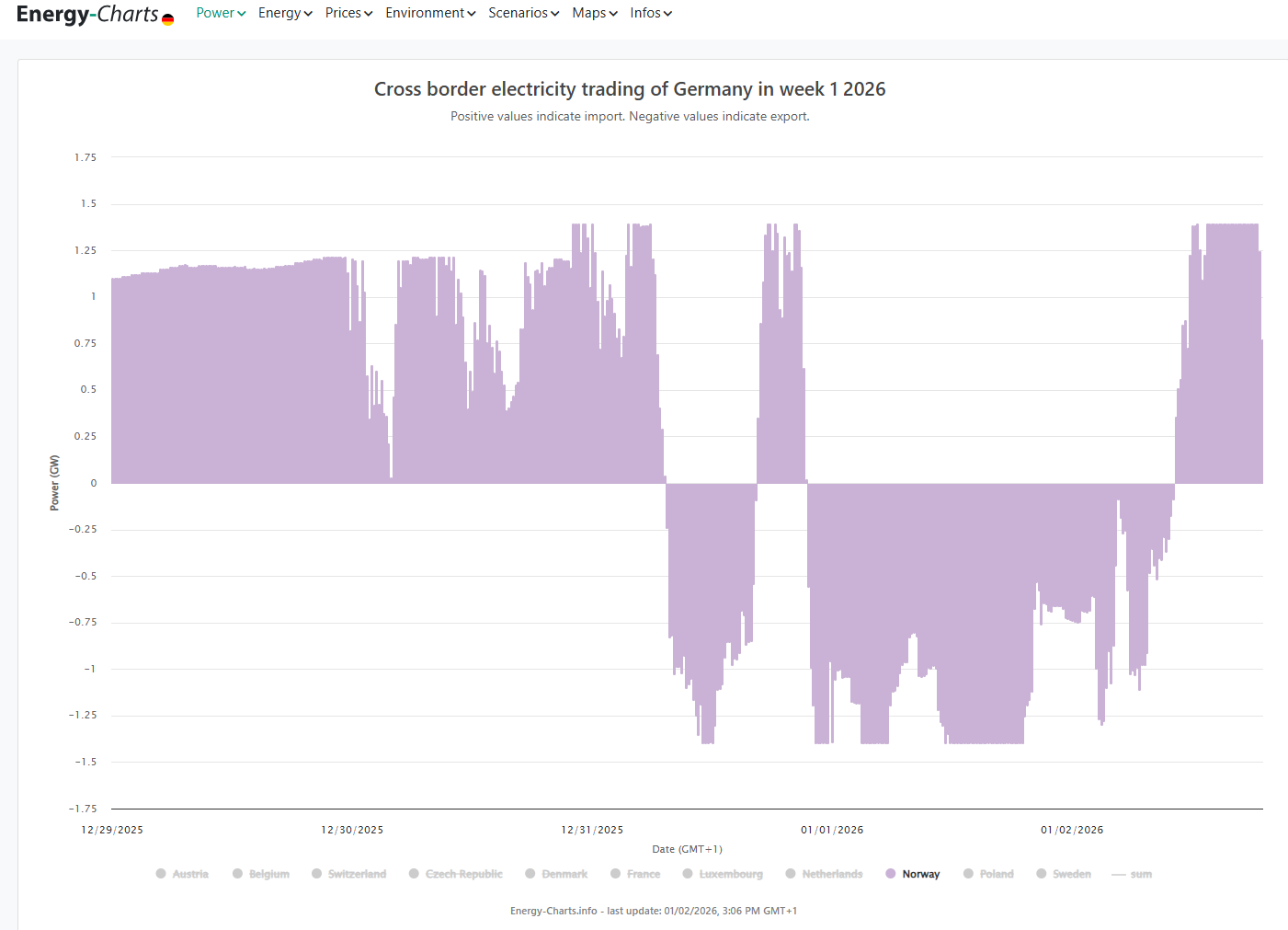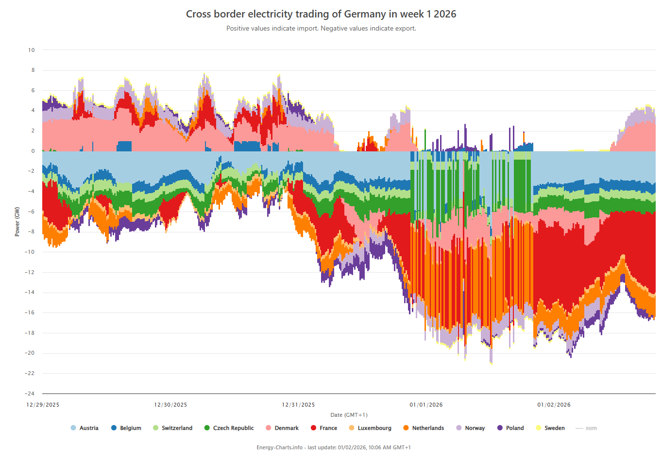 Mens bidraget fra Norge går typisk litt over 1 GW den ene eller andre veien ettersom hva det er behov for. Tyskland er også tidvis en stor eksportør av elektrisitet, om ikke netto eksportør året under ett.
