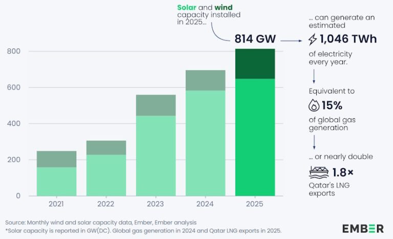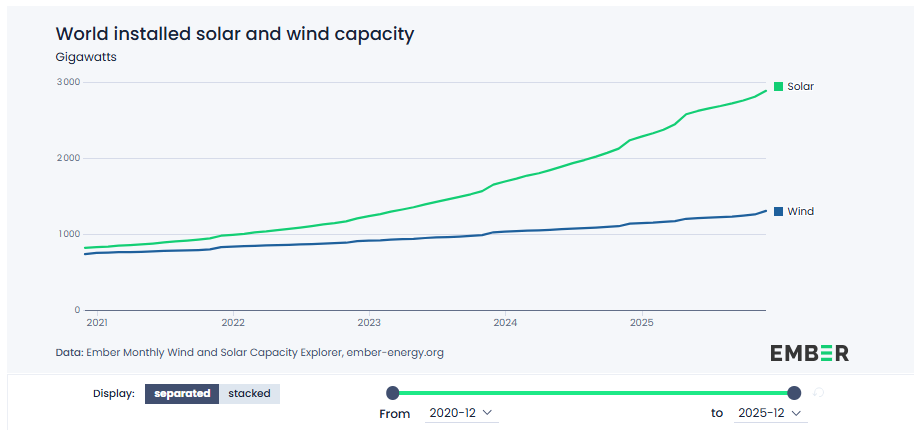 Status for 2025, sol nærmer seg 3 TW installert kapasitet, sol+vind over 4 TW. Økningen i 2025 alene kan produsere mer strøm enn Qatars LNG-eksport (jada, når været spiller på lag). Selskaper som Scatec og Magnora har klart seg veldig bra under Iran-krigen.