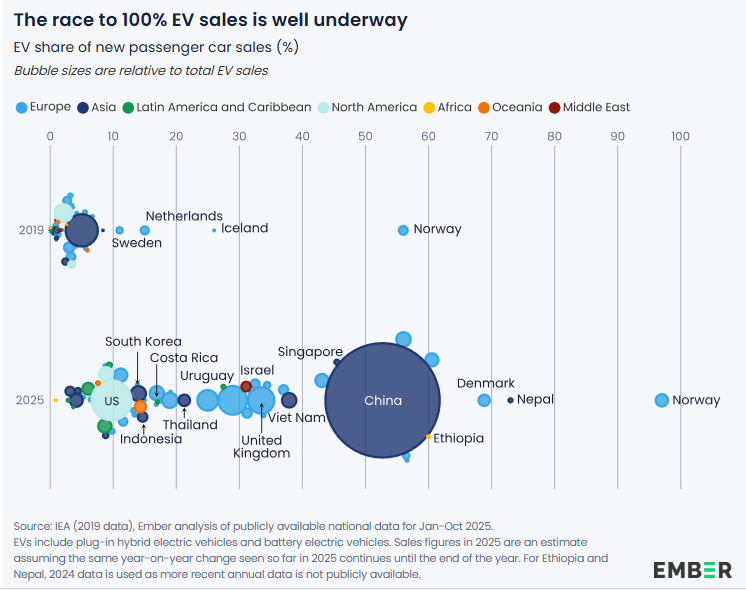 Det synes jeg er helt innafor! Hvor elektrisiteten kommer fra vet vi jo ikke i dette tilfellet. Den trenger ikke være fornybar. Men grønnere elektrisitet og mer elektrifisering er uansett to viktige trender i markedet (selv om man som forelder, bybeboer etc. kunne ønske seg at det gikk enda fortere). Man kan regne på hvor mange fat olje man sparer, men man kan også regne på hvor mye energi man sparer. Man bruker selvsagt mer strøm, men samfunnet bruker mye mindre energi totalt, siden det meste av energien brukes til å lage varme og lyd i en forbrenningsmotor. For hver 100 km som kjøres i elbil i stedet for ICE sparer vi ca. 35 kWt. (15 kWt per 100 km i elbil, 5 l (=50 kWt røffly) per 100 km i ICE. Det blir en del tWh i året hvis man ganger opp med årlig kjørte kilometer. Så bruker man kanskje mer energi på å produsere en elbil, men dette vil også på sikt bli bedre når elbiler blir så gamle at de skrotes og man kan gjenvinne materialer derfra. Kan bli interessant å følge med på salget etter Iran. 2026 har globalt vært svakere enn 2025 hittil, mye pga at salget har roet seg i Kina. Den store vinneren er det som i statistikken er “Rest of World”. vekst på 84 %, et marked som nå er langt større enn hele Nord-Amerika, og snart like stort som hele Europa.