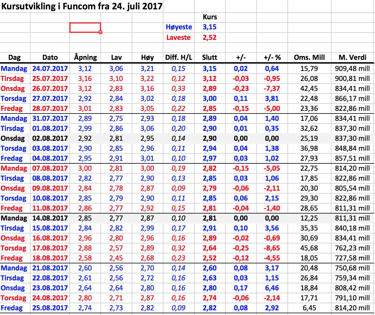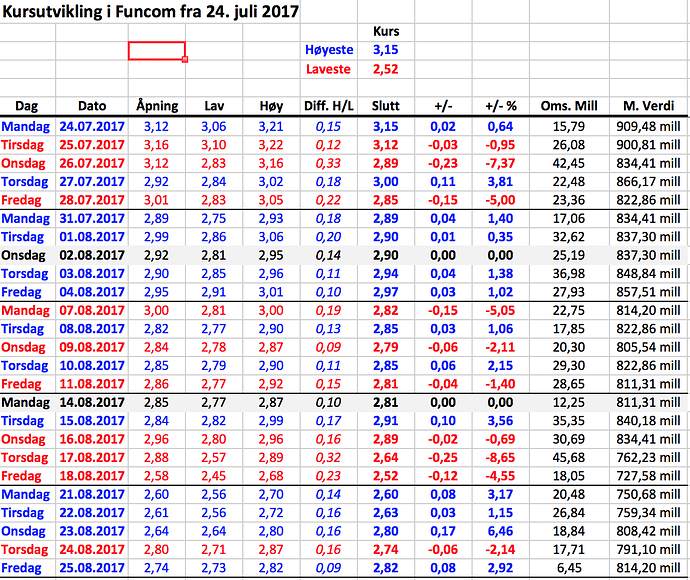 Kanskje flere noterer kursen til Funcom, men her har dere mine notater fra 24. juli t.o.m i dag, 25. august 2017. Håper det er OK?