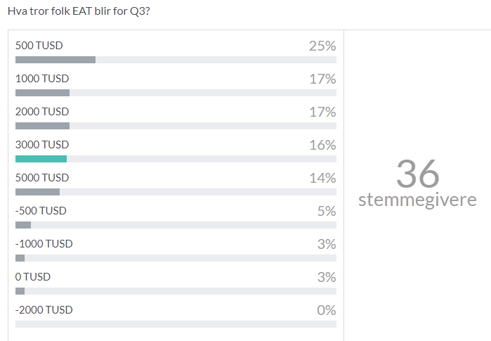 De fleste tror på positive tall, men med EAT (egentlig EBT) på 500-1000 TUSD, så blir det mest sannsynlig negativ cash-flow, noe jeg ikke ser på som et positivt resultat, og det er 42% som mener det blir så dårlig, eller dårligere.