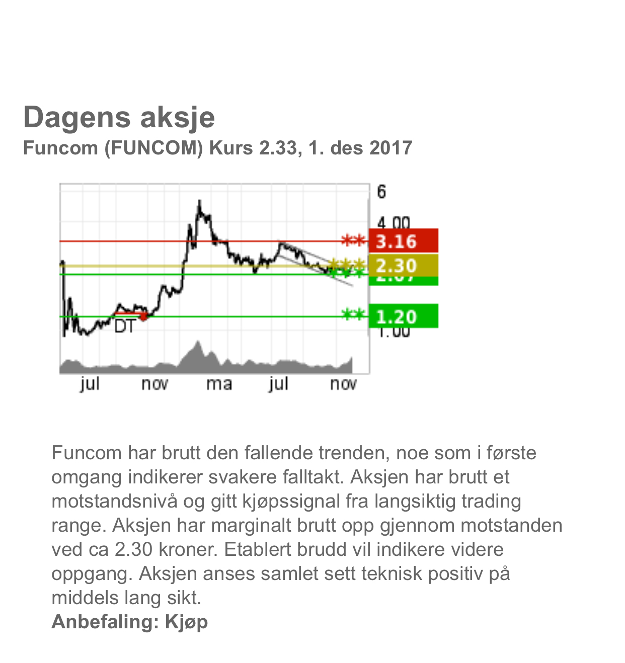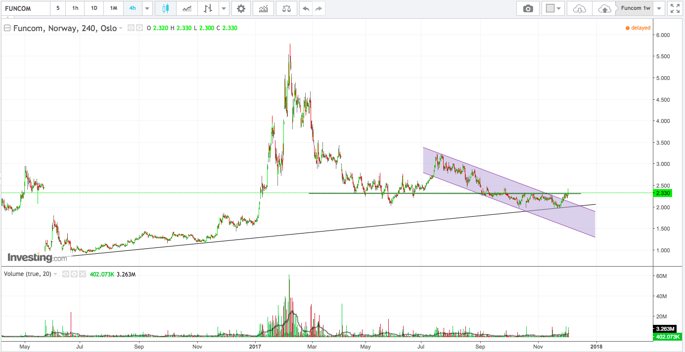 Ser forresten at et analyseselskap anbefaler kjøp av Funcom nå. Håper for de tålmodige i menigheten her sin del at den tar av, gjerne mot og over tidligere høyder på 5.8 ish fra februar (?)
