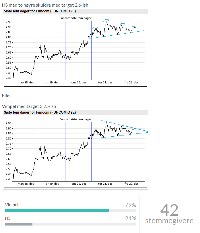 Jeg har kjøpt og solgt i Funcom og har snitt på 2,56 og 4x så mange aksjer som jeg hadde først planlagt. Solgte halvparten av det jeg kjøpte på 2,50 på 2,83 fordi jeg hadde satt for tight stop-loss. For meg var det “bonus”-aksjer som jeg ikke hadde planlagt å kjøpe, så egentlig aksjer jeg har tenkt å “miste” underveis. Hvis jeg ikke finner en ny fin inngang i Funcom går de et annet sted.