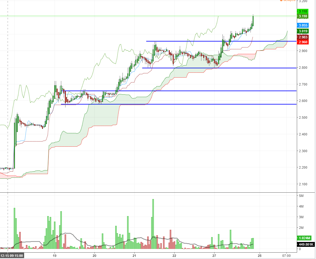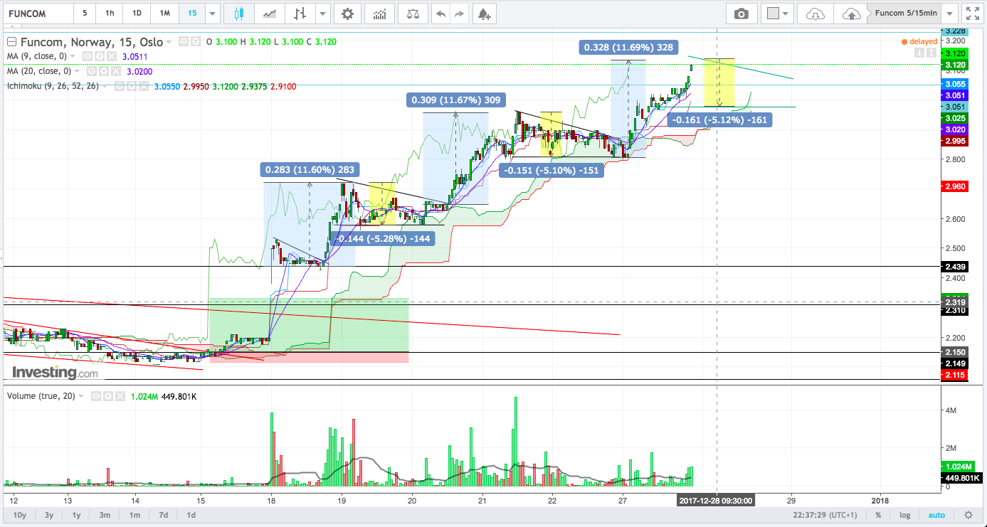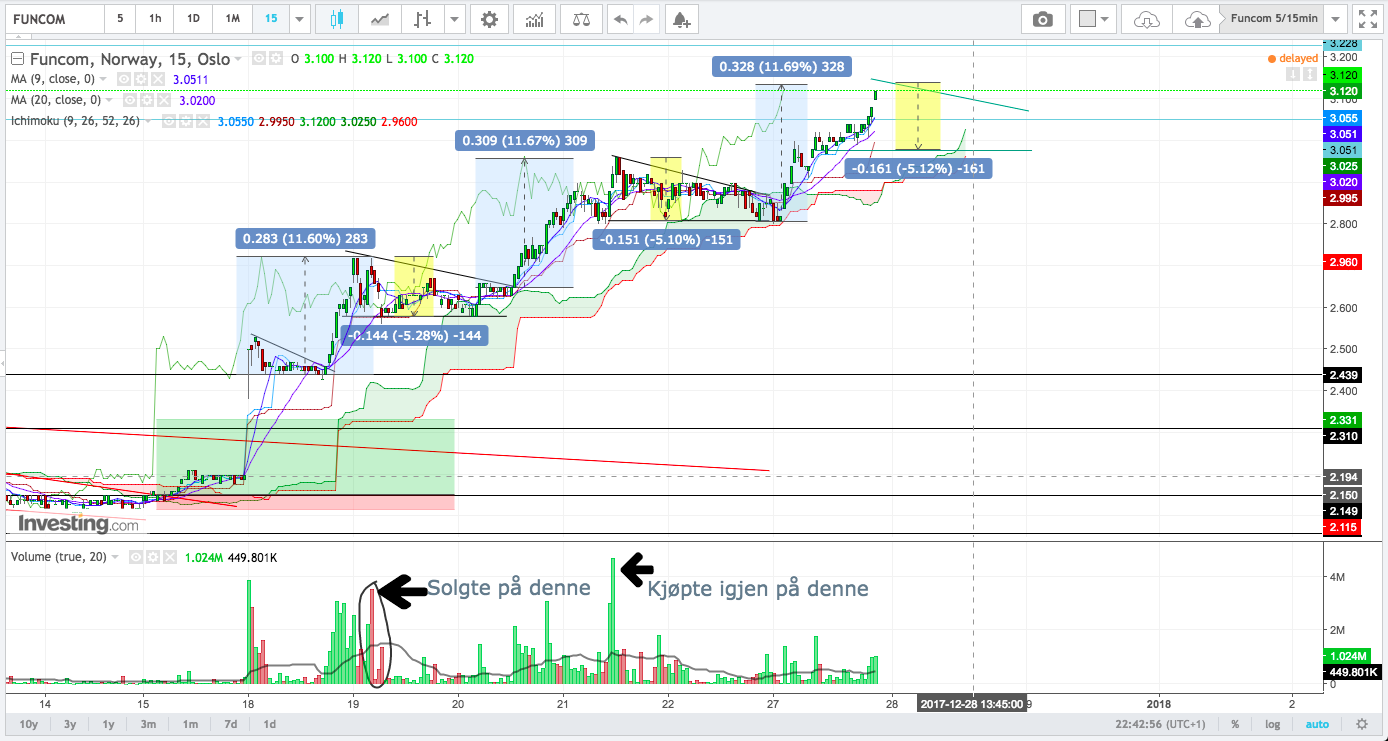 Jeg hadde fulgt med på motstandsnivåene nedenfor, men kanskje viktigere, om momentet i aksje blir holdt oppe. Her har jeg brukt 15-minutters Ichimoku-cloud. På veien opp, så har aksjen mistet moment to ganger, men enda ikke gått gjennom bunnen på skyen og gått inn i en negativ trend.