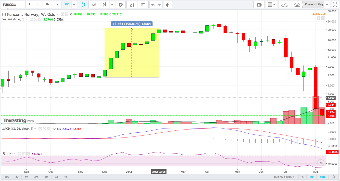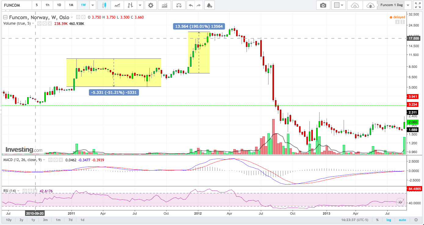 Sist jeg kunne finne Funcom som en av Investtechs raketter, var i 2012. Det resulterte i en oppgang på 190% og denne oppgangen varte til februar hvor den startet konsolidering.