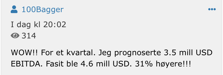 Det kan godt være vi closer godt under, men at vi er innom 20-tallet? Jo, mye mulig. Det var solide tall i dag og utfra poll her på forumet, så var det mange som forventet seg mye lavere inntekter, og utgiftene var veldig godt under kontroll. Jeg hadde sett for meg -0,5 til +2,5 MUSD i resultat. Fasit er +2,2 MUSD. Det er da veldig sterkt. MYZ-lanseringer er ikke langt unna nå og det blir et koselig Q4 også