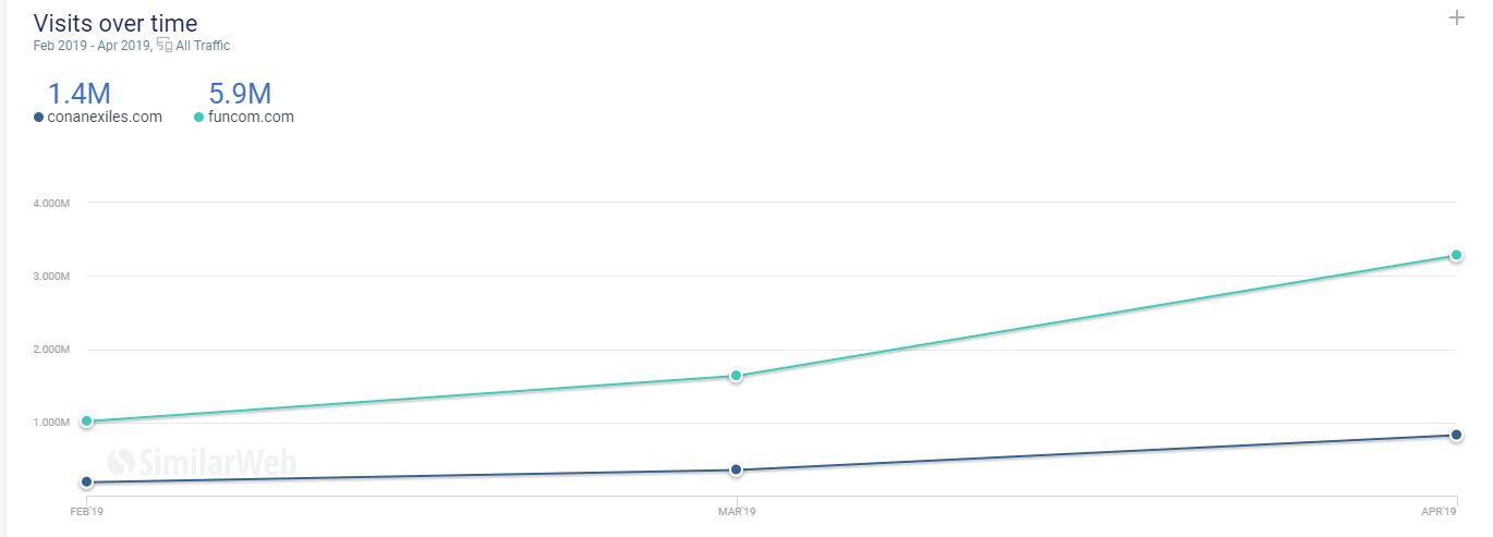 Økningen på conanexiles.com er enda større, selv om flere er innom hjemmesiden til Funcom. Det ser kanskje ikke sånn ut på grafen her, men conanexiles.com har en prosentvis økning på 136%.