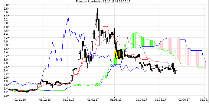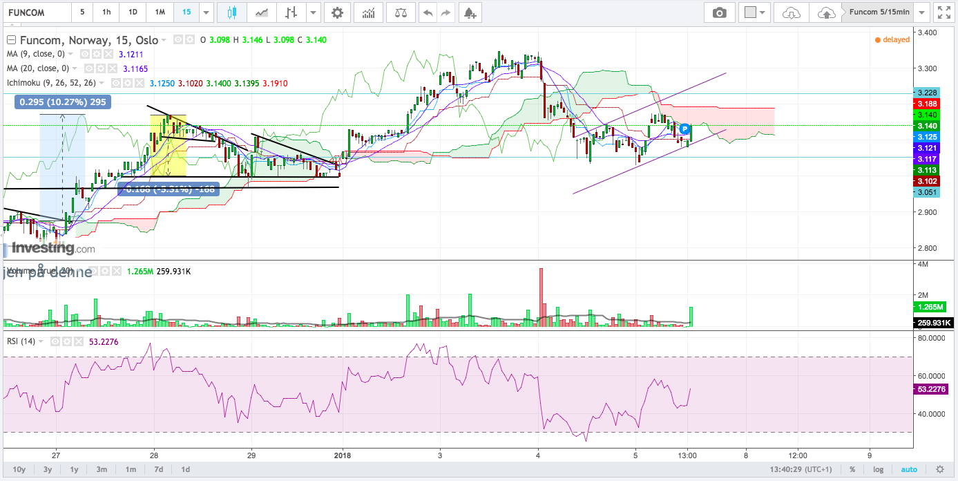 Jeg har brukt 30 minutters grafen nå, og innser at jeg da også burde ha vært klar til å kjøpe inn igjen hvis TA-en snudde, så kanskje 1-2 handler om dagen når det blåser som best/verst. Det jeg da hadde fått ut av det vs å bare bruke dagsgrafen er at jeg kunne ha kommet meg ut av Funcom på 5 kr i stedet for å sitte på laaaangt ned til rundt 3 kr. Må bare finne litt mer ut av det.