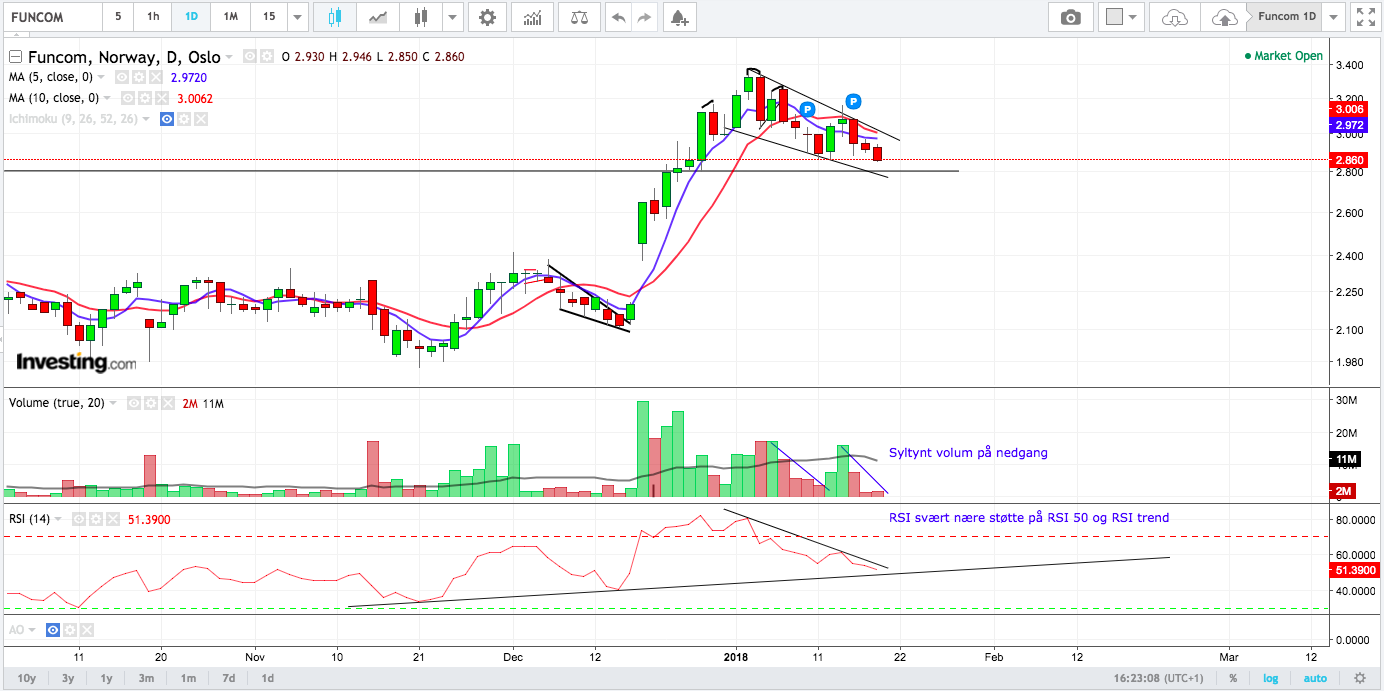Hegnar anser det som sannsynlig at kursen skal teste 50-dagers glidende snitt. Ryker denne kan kursen gå til 2,40 og 2 kroner (lol). Bemerket at bruddet opp gjennom 3,20 og kjøpssignalet ikke medførte videre oppgang. Mest bla bla bla kan gå begge veier. Oppsummert ganske positive, egentlig.