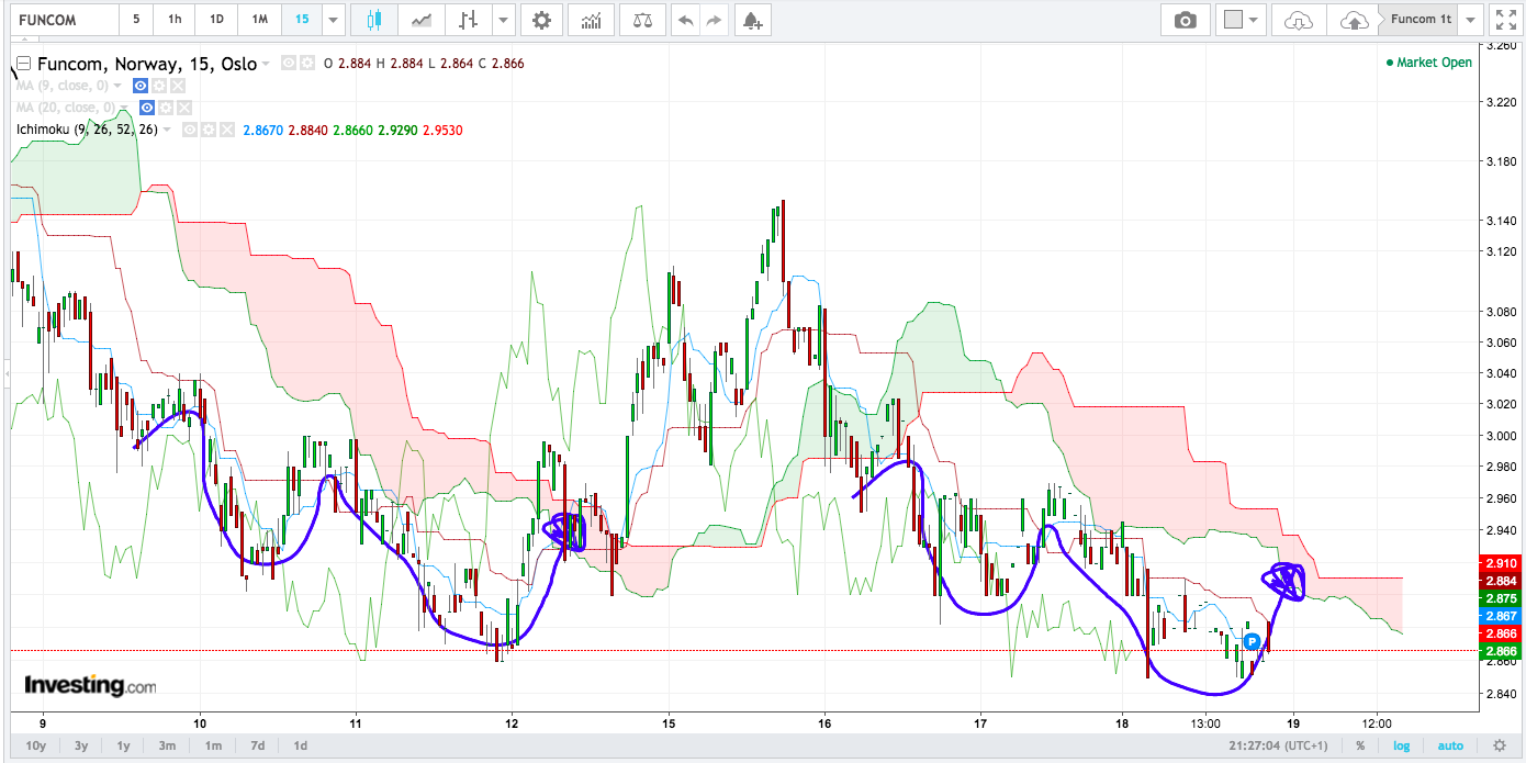 Hvis man ser på 1D chartet, så er det klart at vi er i en opptrend, så det er lov å rote litt rundt i aksjen, men i de mer kortsiktige chartene, så er det jo klart at utviklingen ikke er helt positiv.